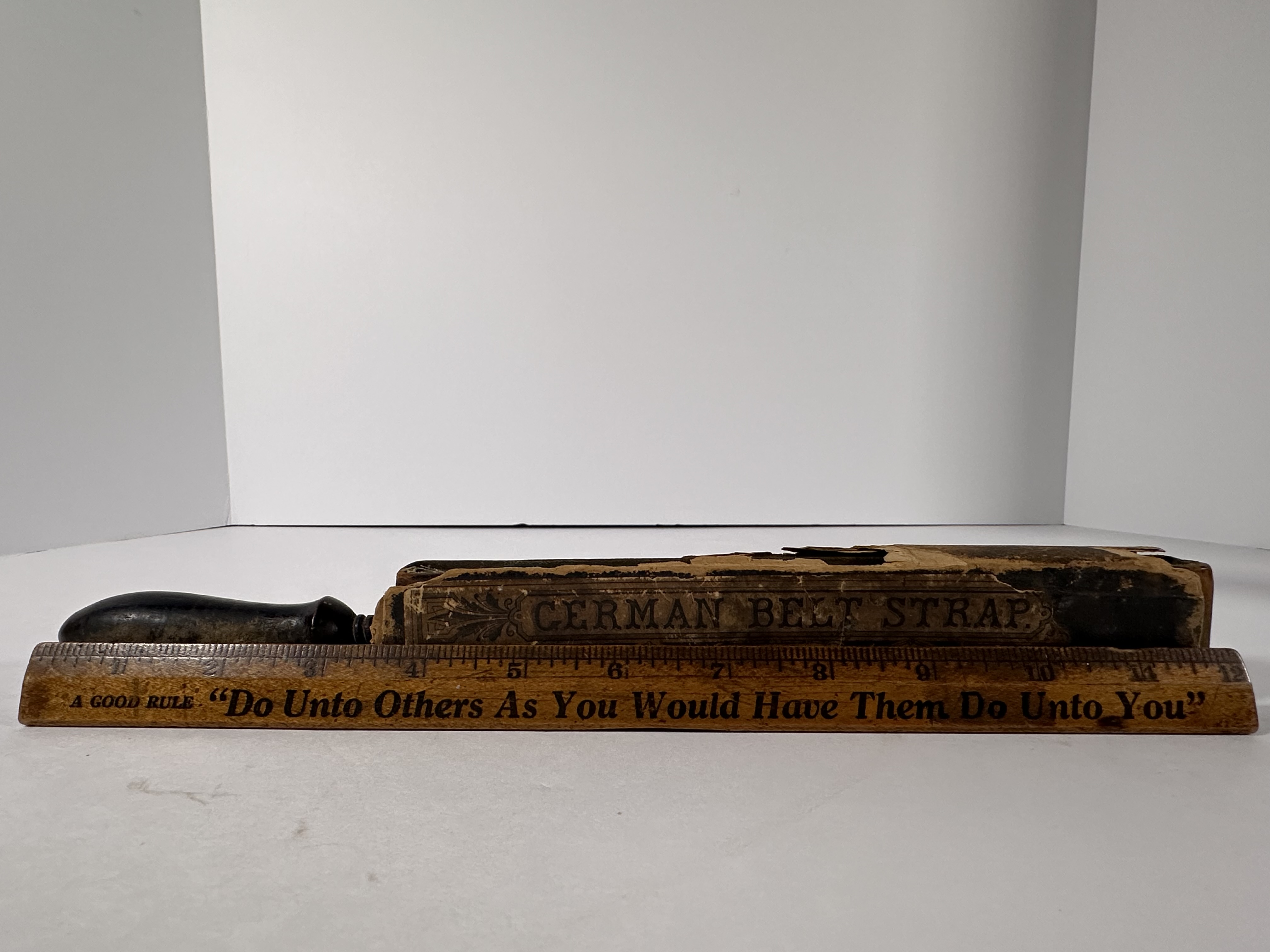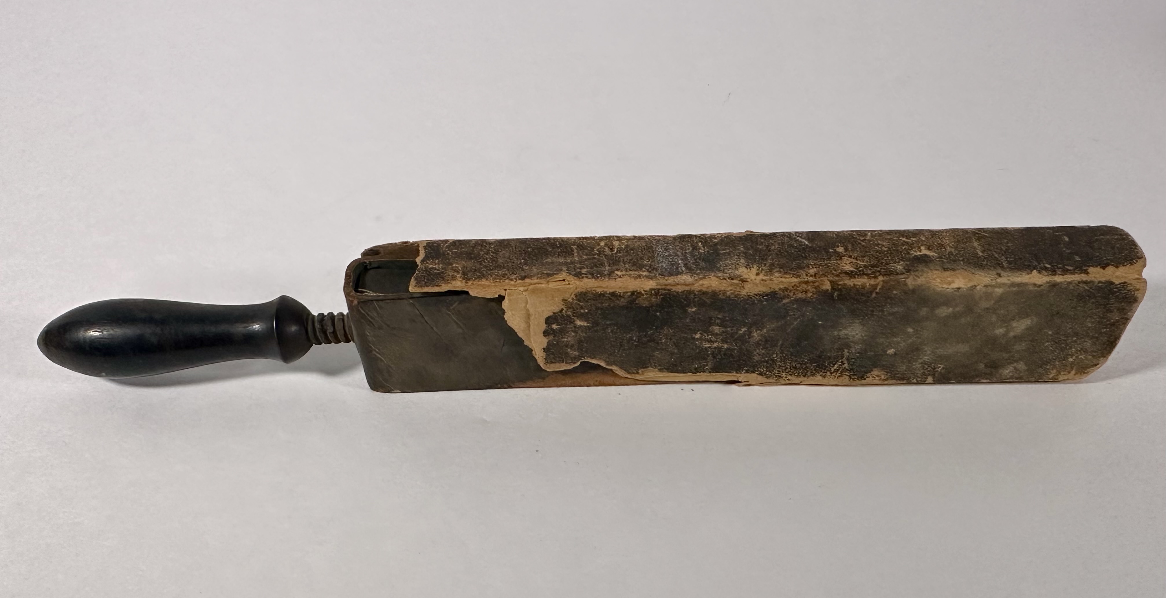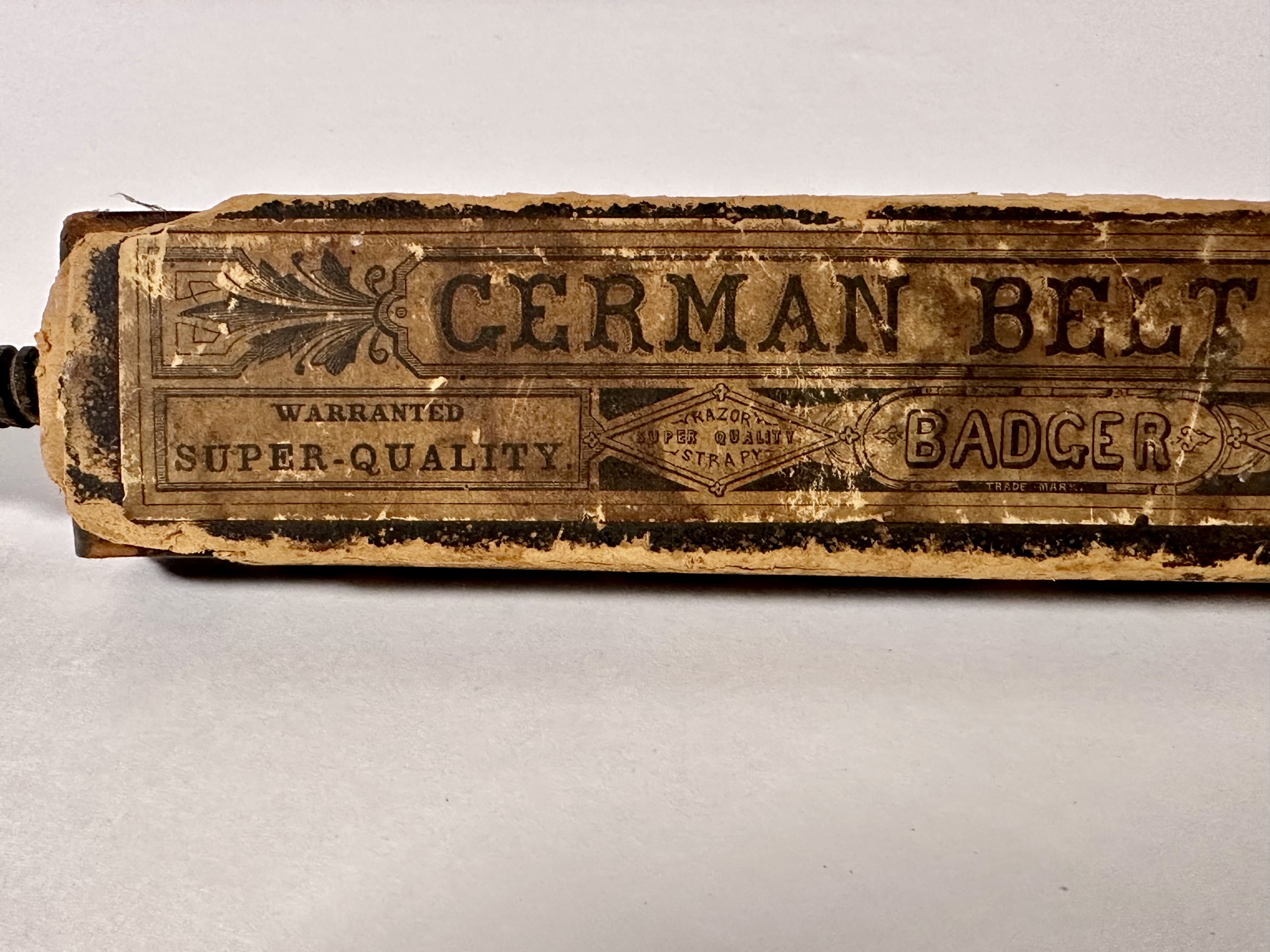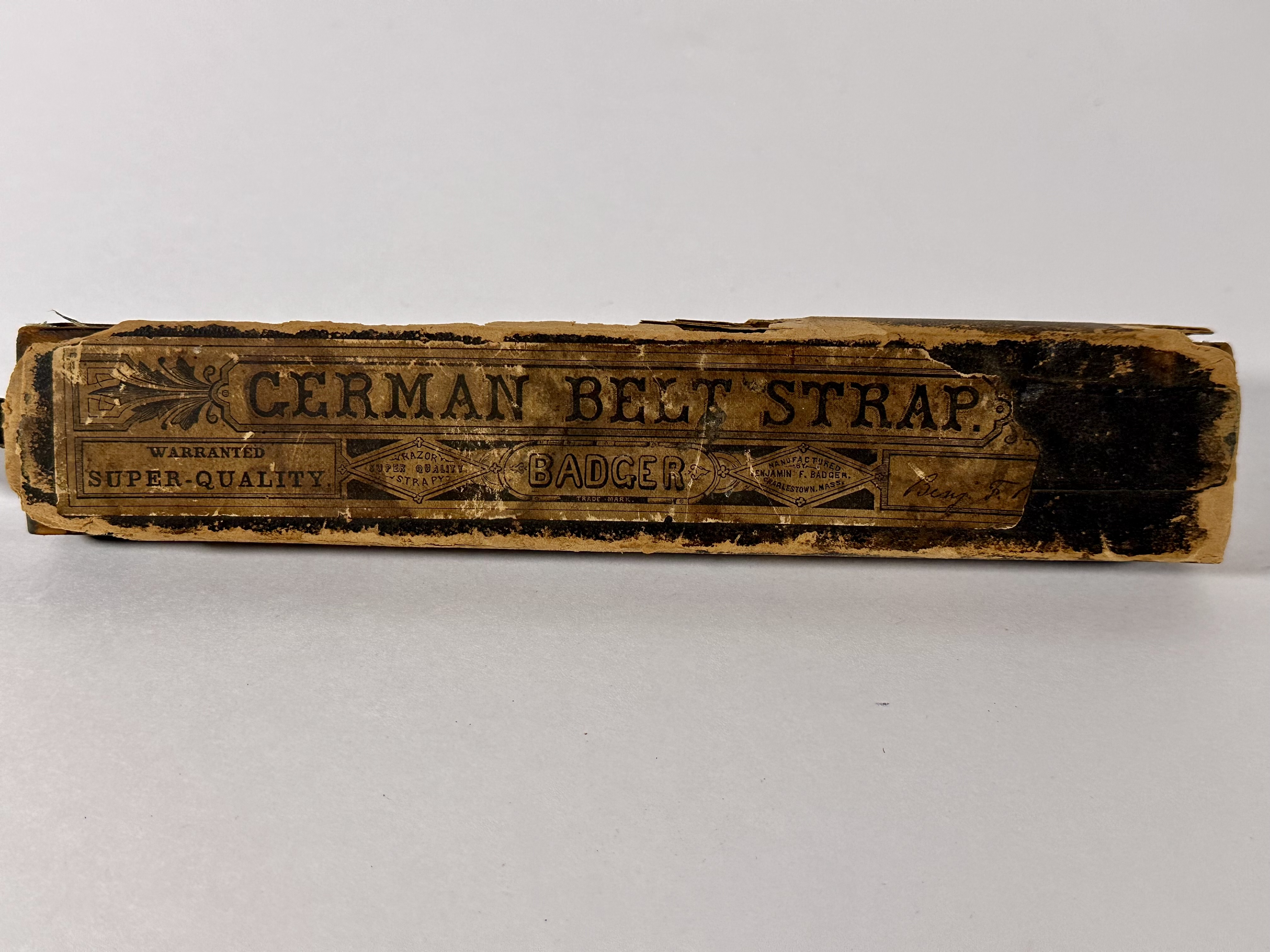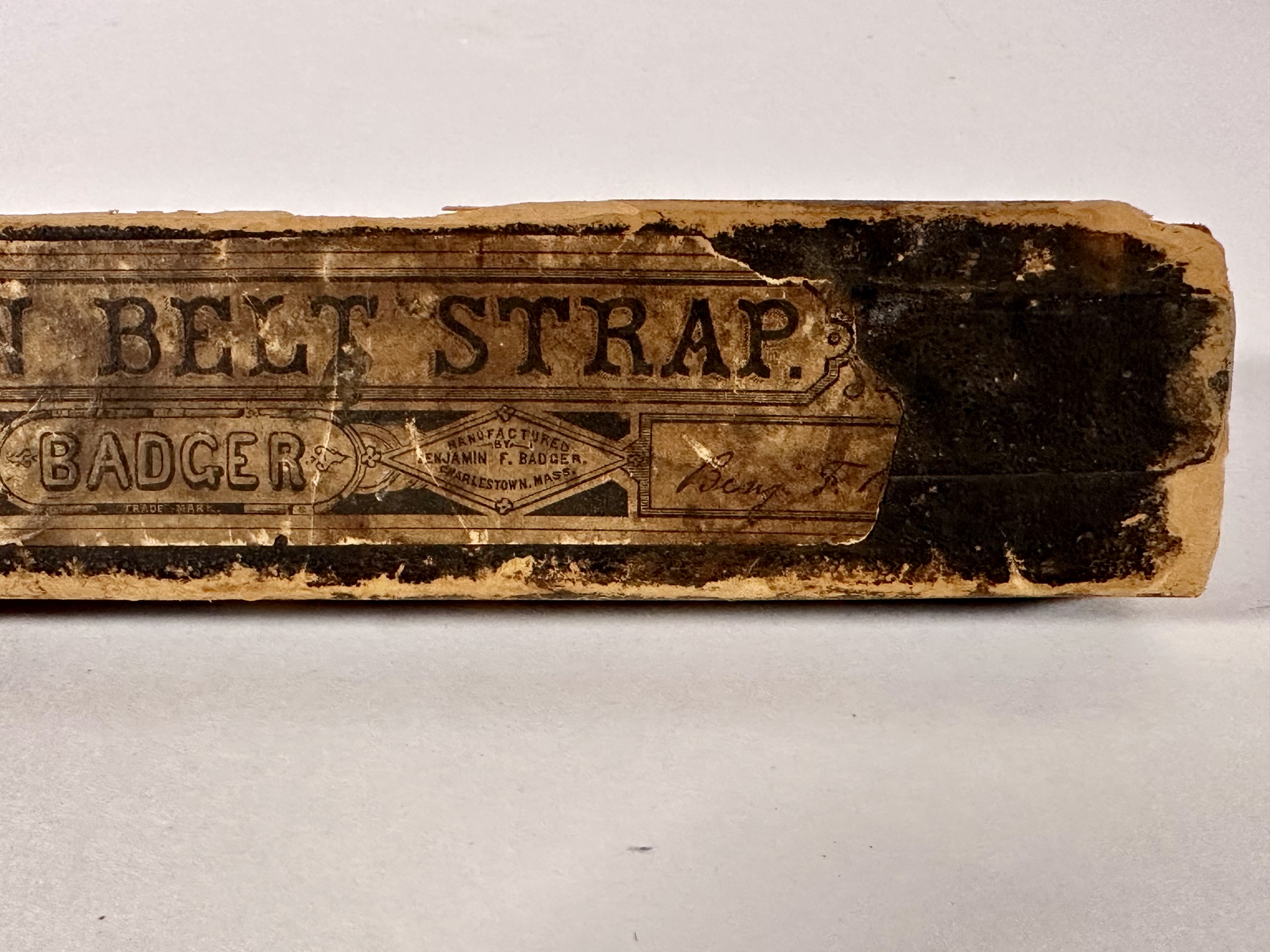 Antique Barber Razor Strop for your consideration. The strop measures approx. 12 1/4 inches long, 1 5/8 inches wide and 7/8 of an inch thick. American, 19th Century. Made by Benjamin F. Badger, Charlestown, Massachusetts. Razor strop (strap). Original, old box covering, advertisement reads, “GERMAN BELT STRAP” “WARRANTED SUPER-QUALITY” “RAZOR SUPER QUALITY STRAP” “BADGER” “MANUFACTURED BY BENJAMIN F. BADGER CHARLEWTOWN, MASS.”. Original wooden handle with wooden threaded dowel that screws into leather wrapped sharpening stone. Good antique condition. Shows wear commensurate with age and use. Box covering is missing in some areas. See photos. Displays splendid!
