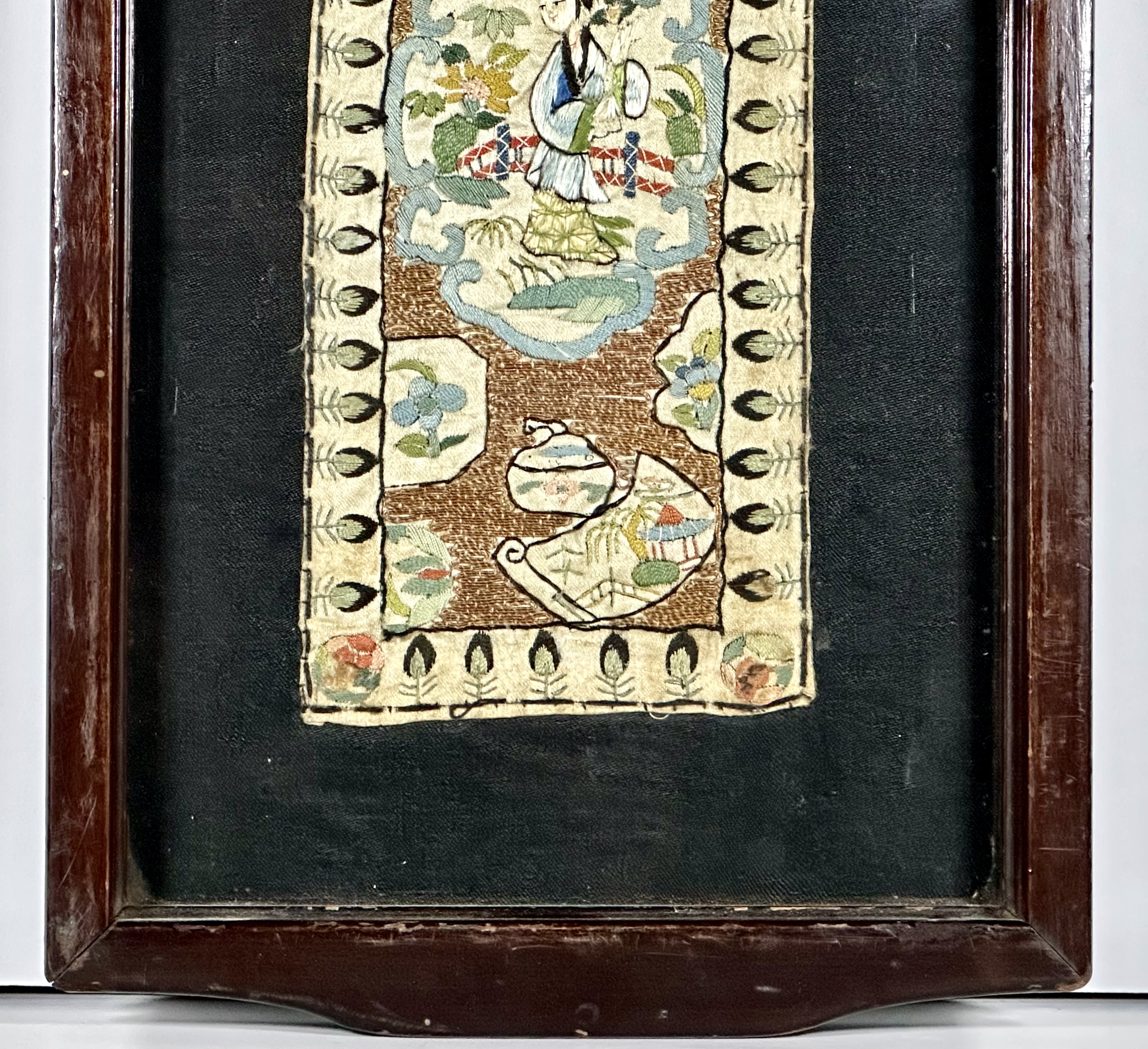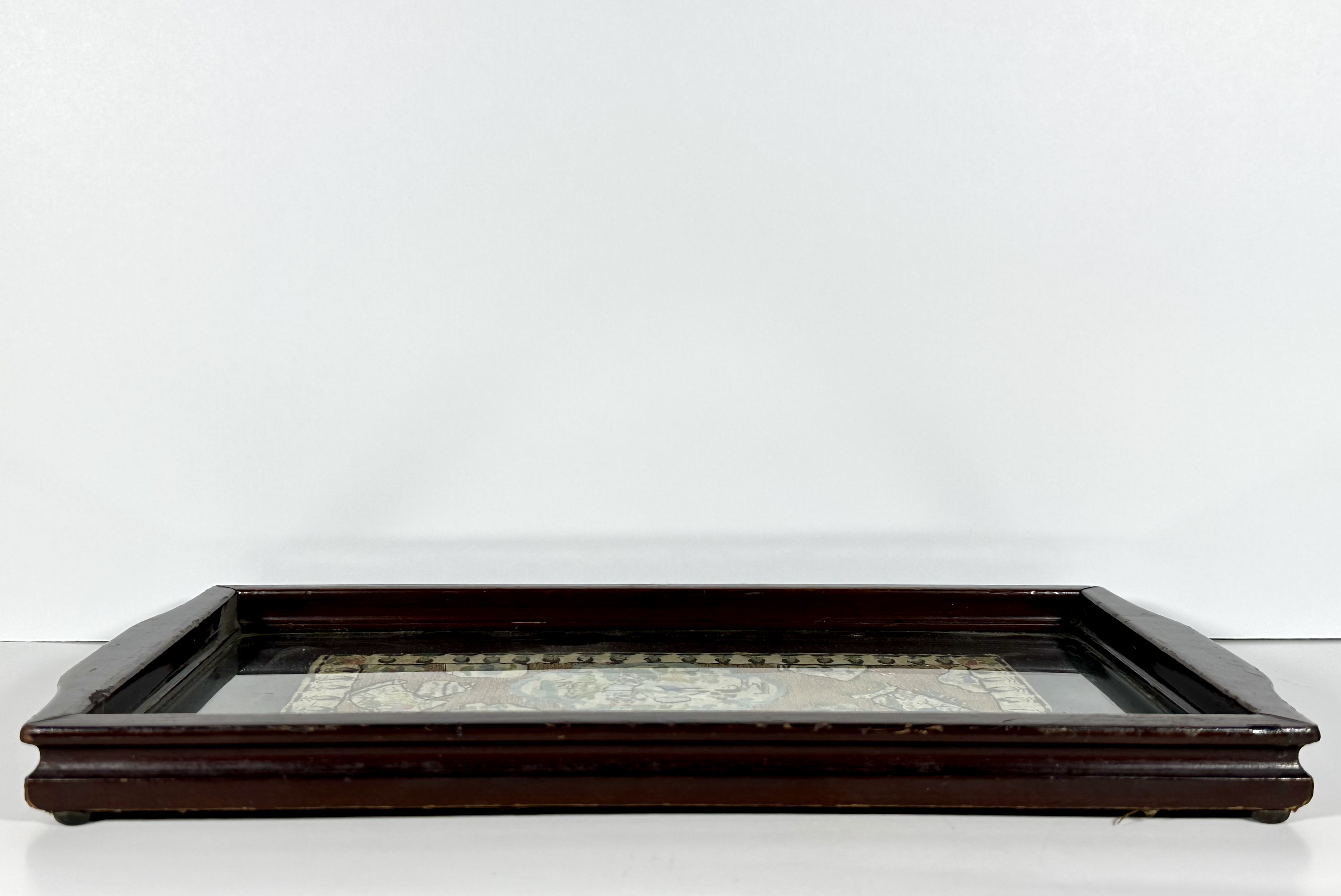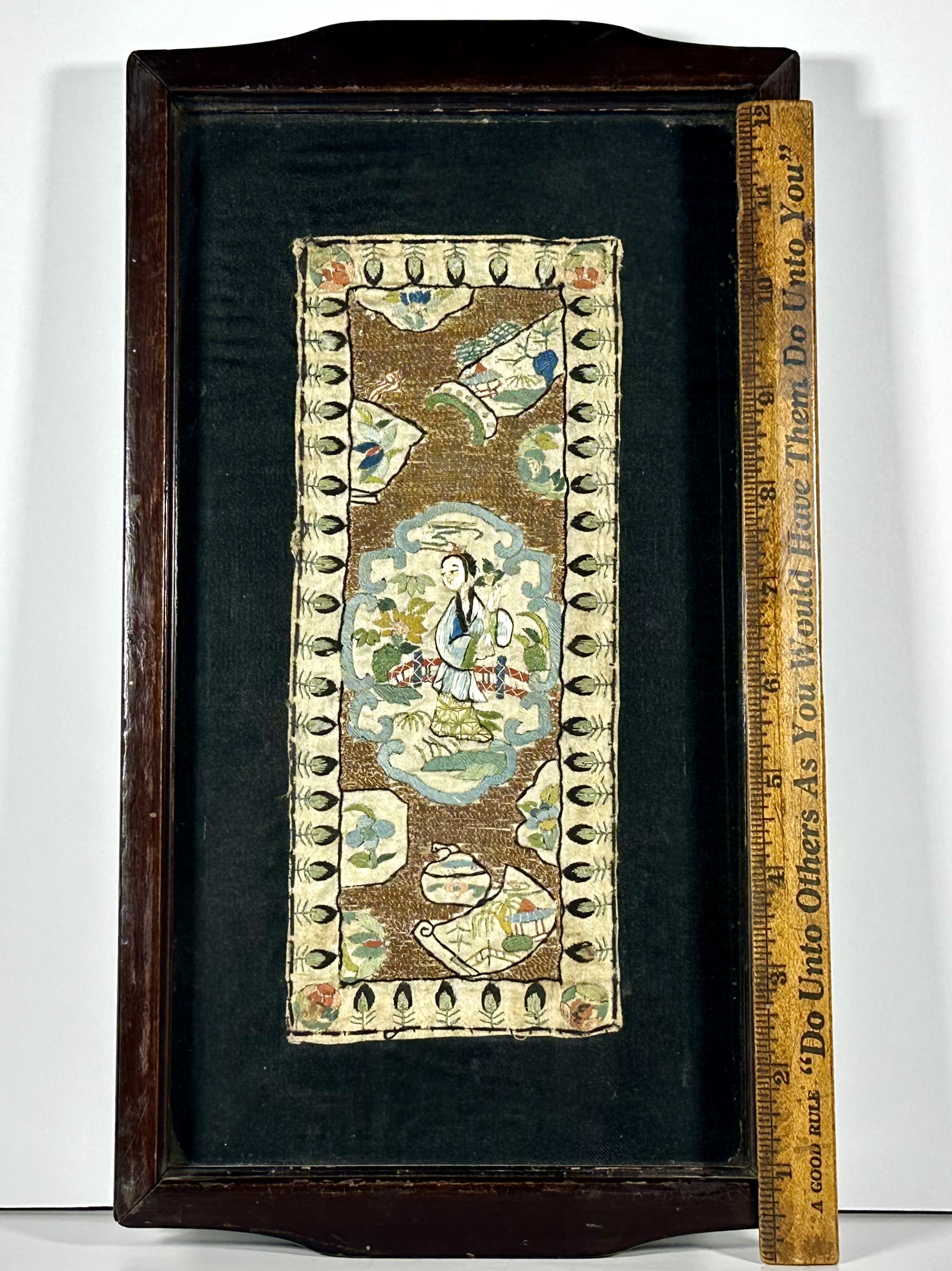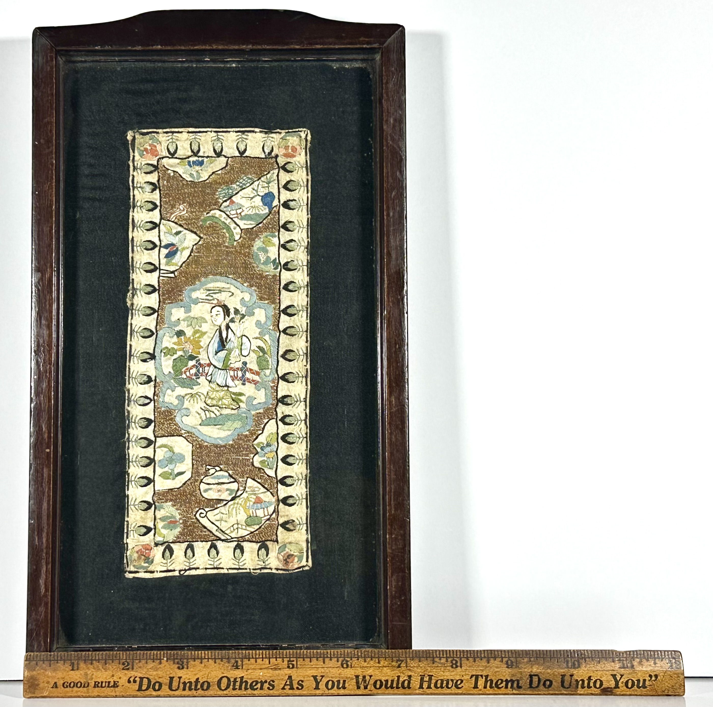 Antique Chinese Silk Embroidery Framed Tray for your consideration. The framed textile measures approx. 7 1/8 inches X 13 inches and approx. 7/8 of an inch thick. Textile fragment measures approx. 3 1/2 inches X 8 5/8 inches. Chinese, Qing Dynasty, 19th Century. Chinese Export. Rectangular. Finly hand-stitched silk embroidery, gold threading. Fragment likely taken from ornamental garment. Depicts Geji figure in garden setting in center. Paneled floral motifs decorated throughout including floral patterned border. Artwork is under glass and encased in old, dark-red lacquer framed tray. Reverse, base covered in old lacquered black cloth including four cushioned ends in each corner. Very good antique condition. Shows wear commensurate with age and use. Textile has not been examined outside of framed tray. See photos. Displays splendid!