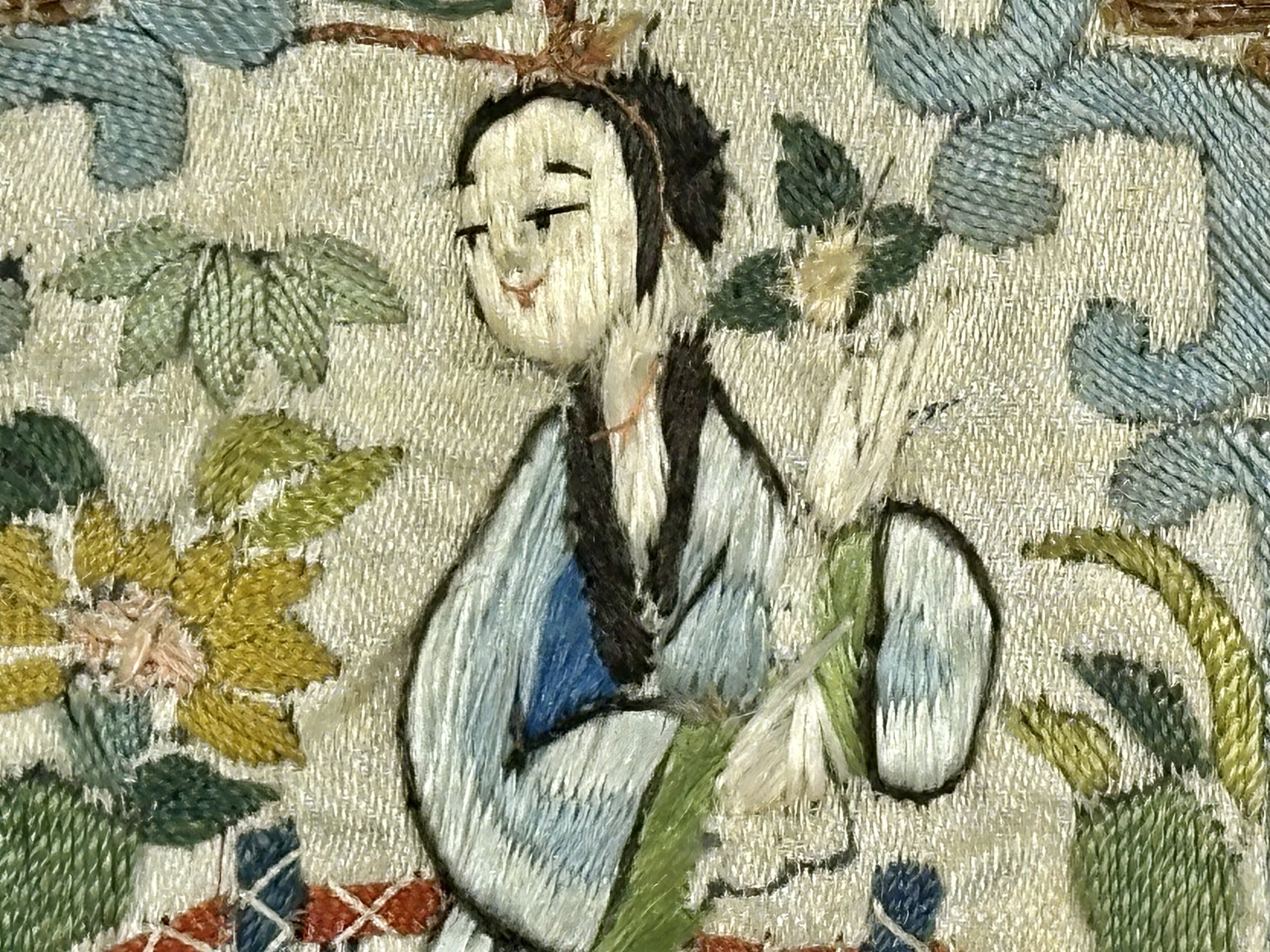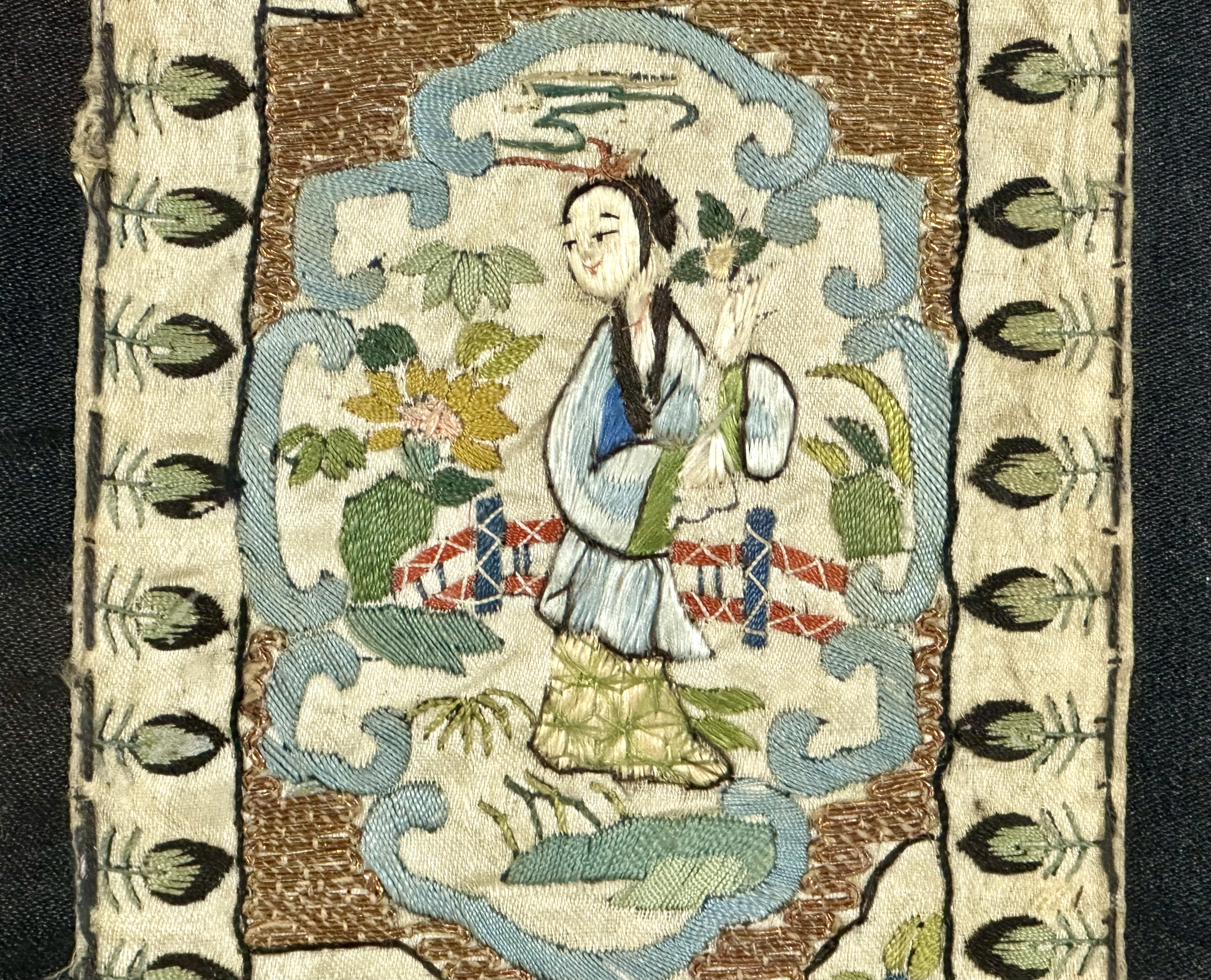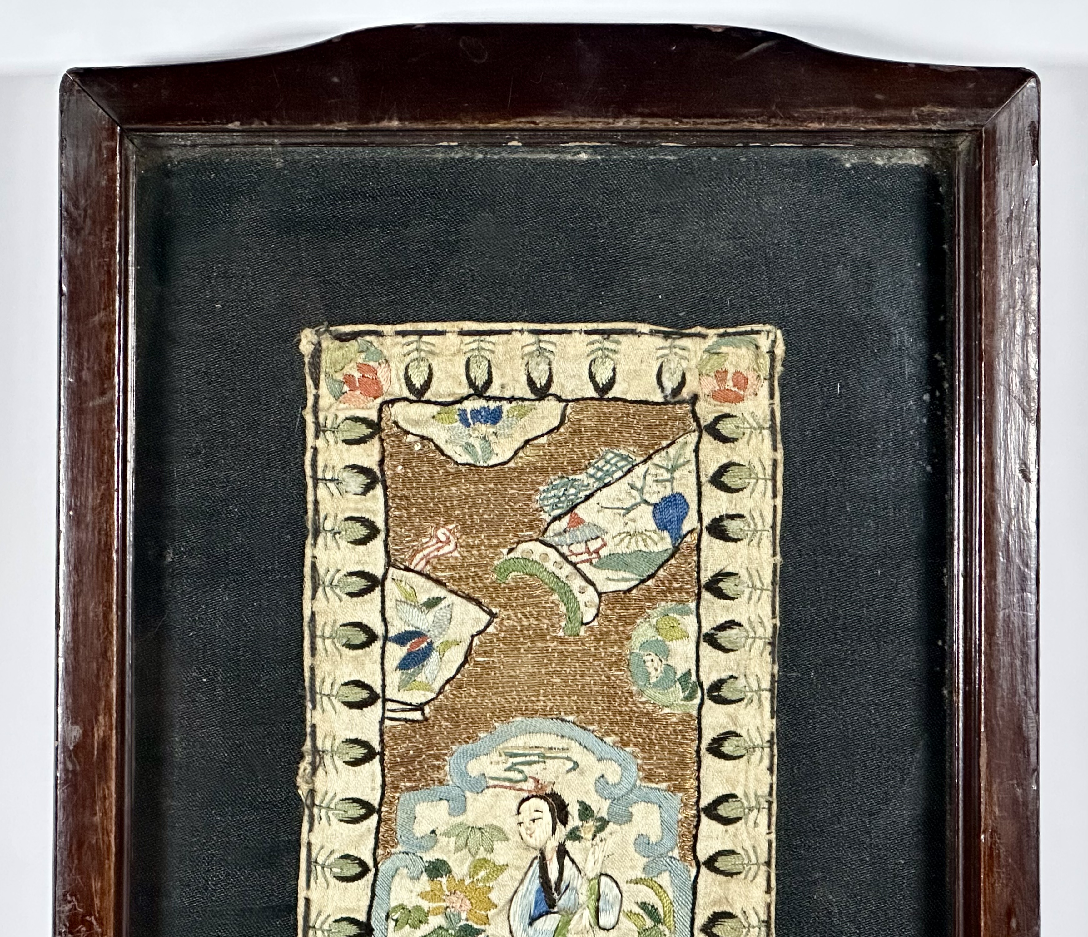 Antique Chinese Silk Embroidery Framed Tray for your consideration. The framed textile measures approx. 7 1/8 inches X 13 inches and approx. 7/8 of an inch thick. Textile fragment measures approx. 3 1/2 inches X 8 5/8 inches. Chinese, Qing Dynasty, 19th Century. Chinese Export. Rectangular. Finly hand-stitched silk embroidery, gold threading. Fragment likely taken from ornamental garment. Depicts Geji figure in garden setting in center. Paneled floral motifs decorated throughout including floral patterned border. Artwork is under glass and encased in old, dark-red lacquer framed tray. Reverse, base covered in old lacquered black cloth including four cushioned ends in each corner. Very good antique condition. Shows wear commensurate with age and use. Textile has not been examined outside of framed tray. See photos. Displays splendid!
