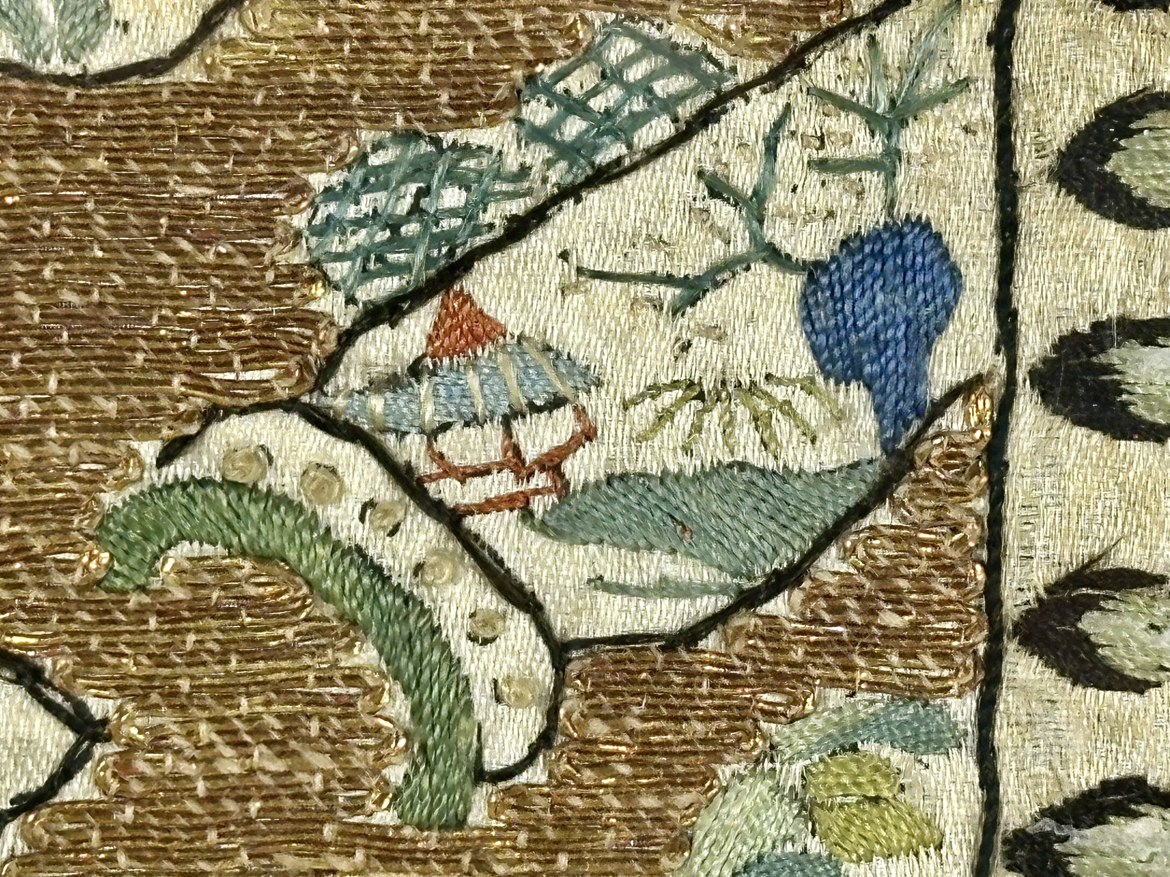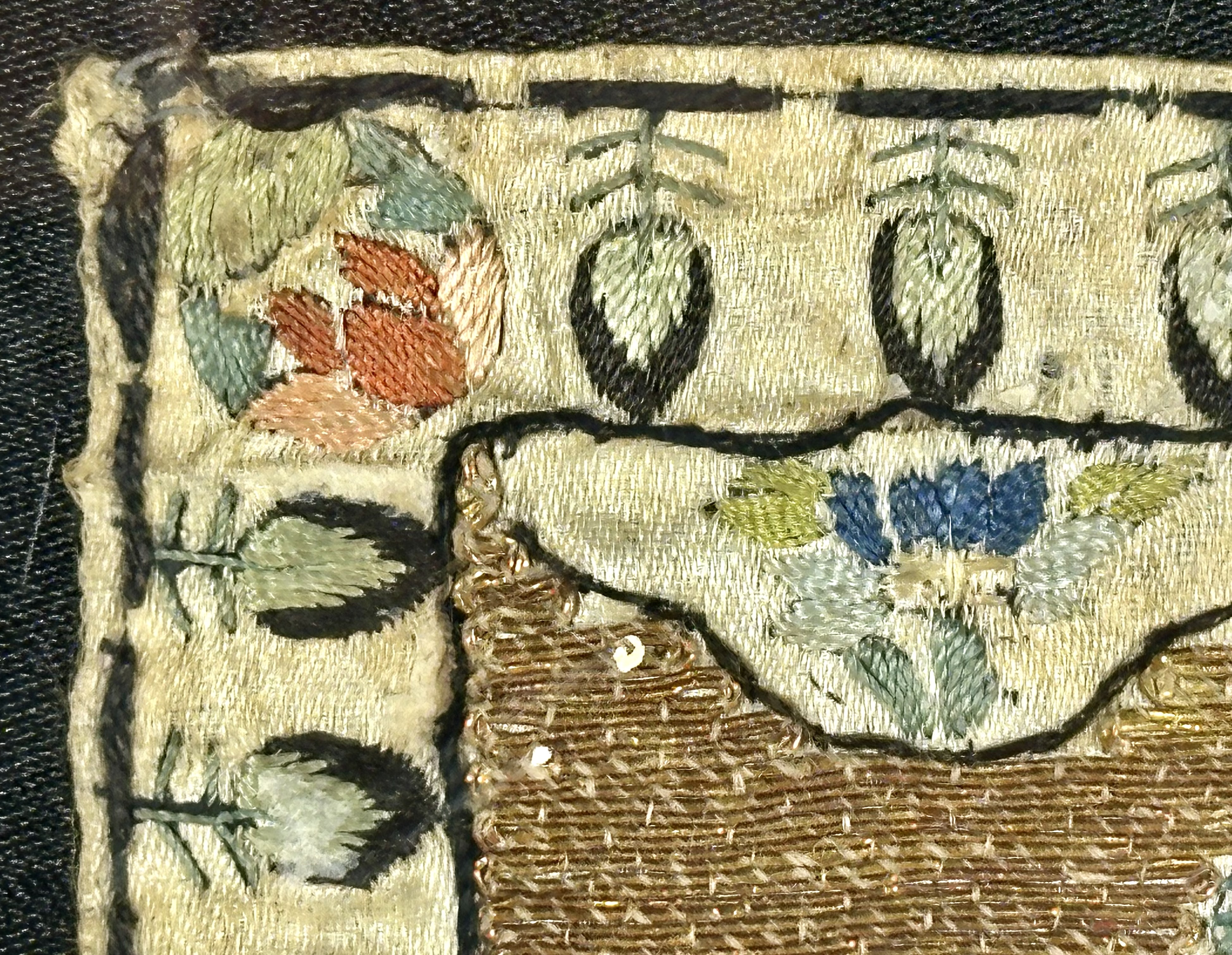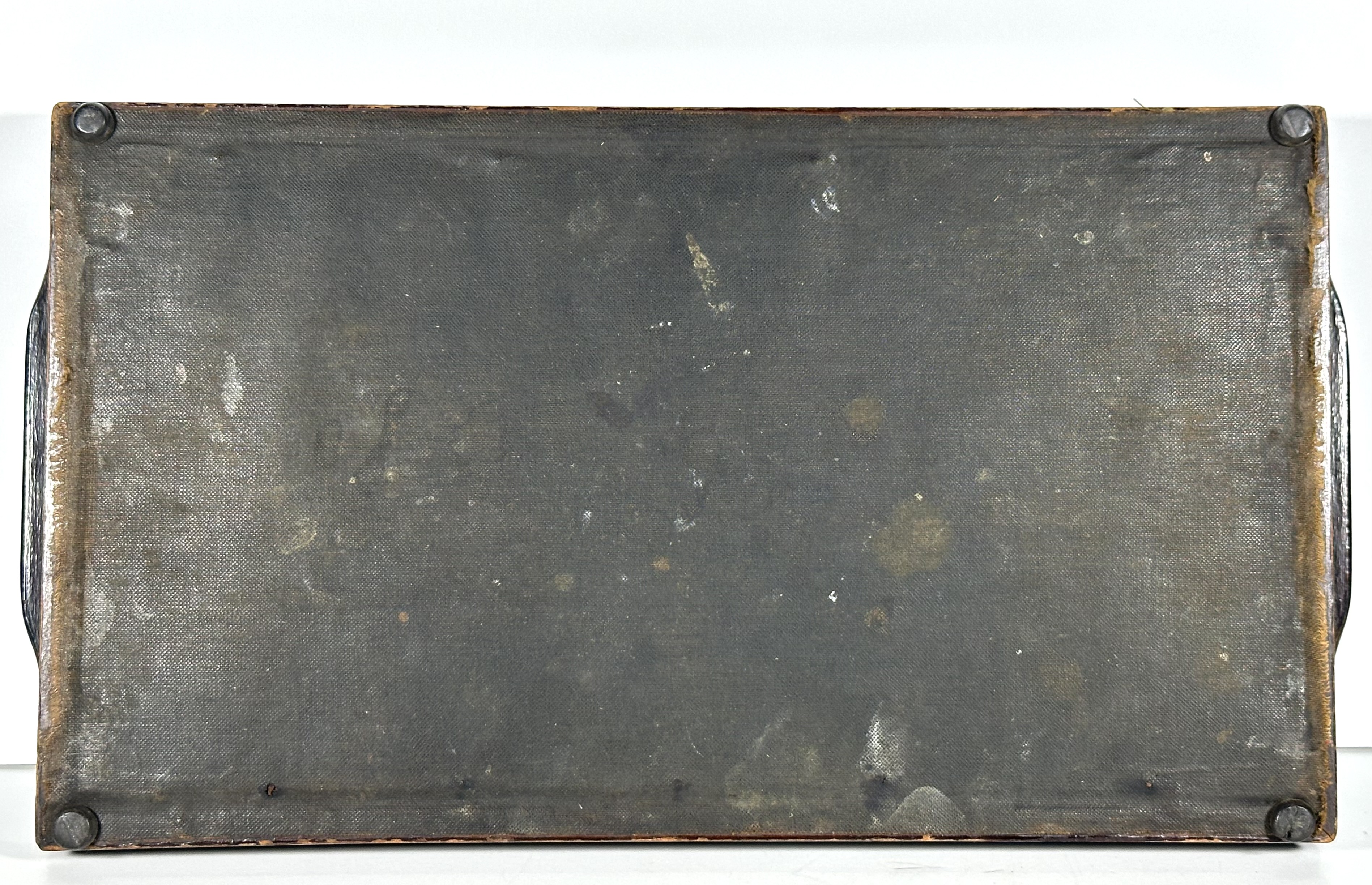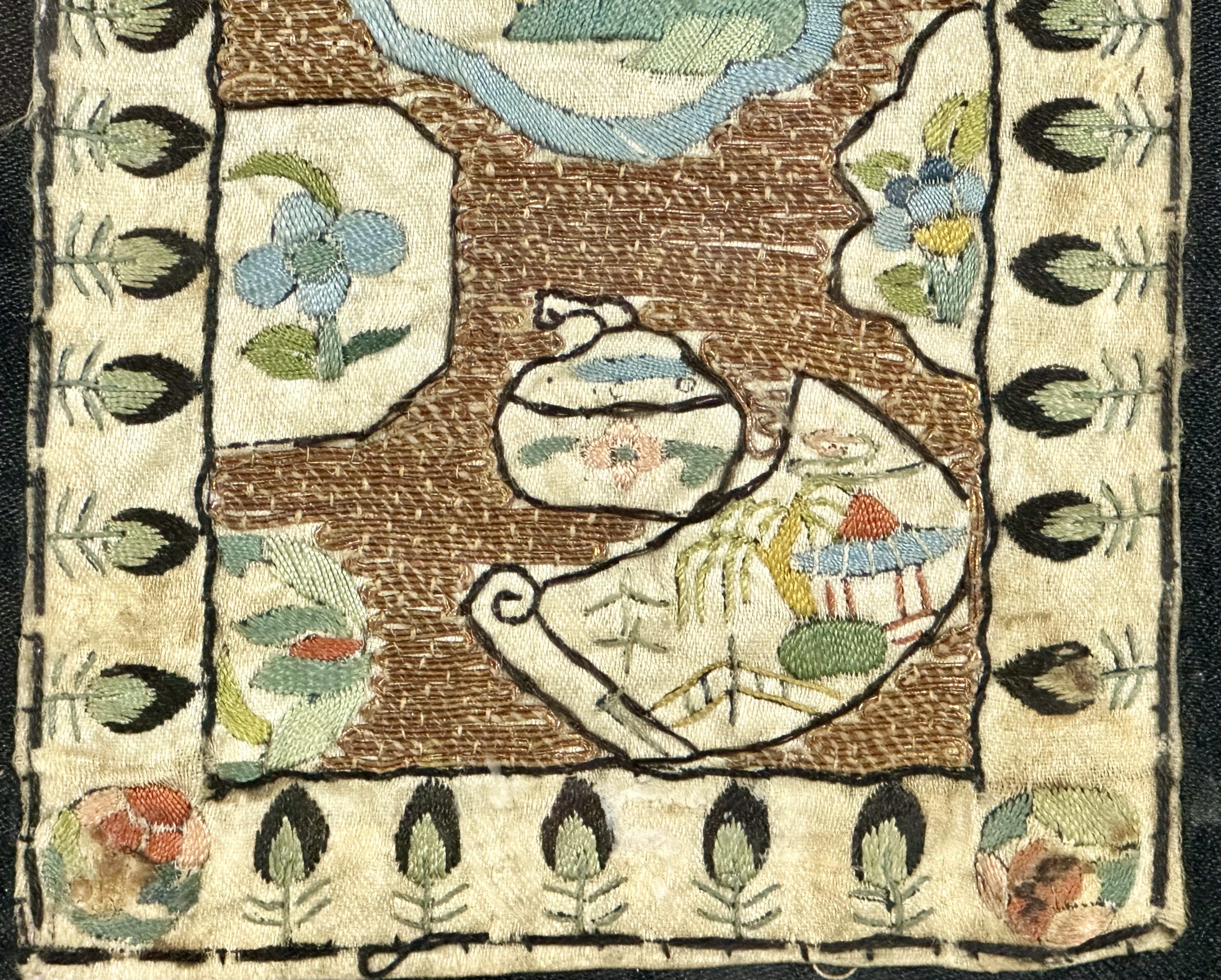 Antique Chinese Silk Embroidery Framed Tray for your consideration. The framed textile measures approx. 7 1/8 inches X 13 inches and approx. 7/8 of an inch thick. Textile fragment measures approx. 3 1/2 inches X 8 5/8 inches. Chinese, Qing Dynasty, 19th Century. Chinese Export. Rectangular. Finly hand-stitched silk embroidery, gold threading. Fragment likely taken from ornamental garment. Depicts Geji figure in garden setting in center. Paneled floral motifs decorated throughout including floral patterned border. Artwork is under glass and encased in old, dark-red lacquer framed tray. Reverse, base covered in old lacquered black cloth including four cushioned ends in each corner. Very good antique condition. Shows wear commensurate with age and use. Textile has not been examined outside of framed tray. See photos. Displays splendid!