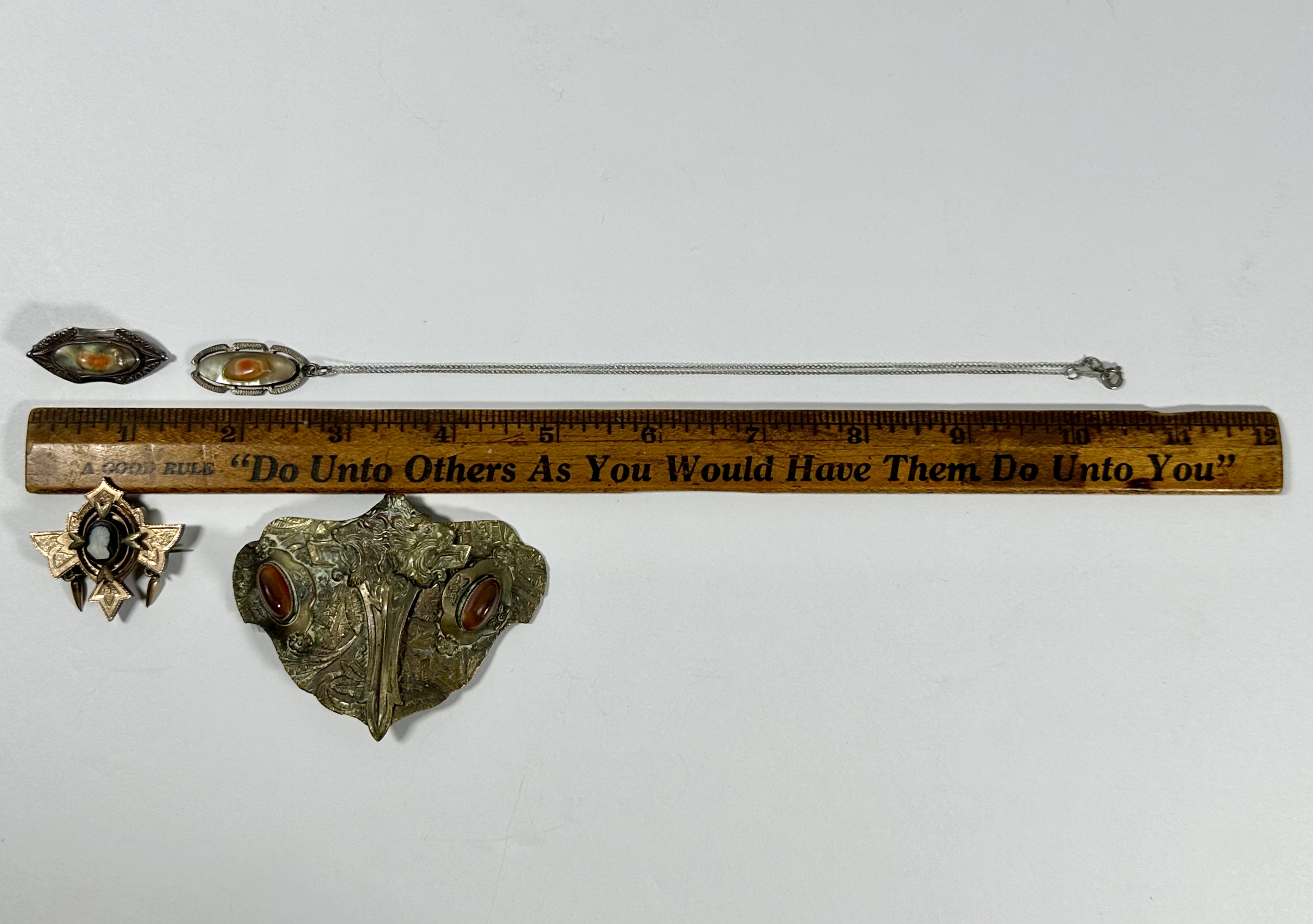 4. Victorian Gold-Filled Mourning Black Glass Cameo Pin Brooch. Measures approx. 1 1/2 inches X 1 1/2 inches and approx. 1/2 of an inch thick. Decorative Aesthetic Movement designed cross with two dangling spears. Raised triple oval mount with black glass, white cameo of maiden.