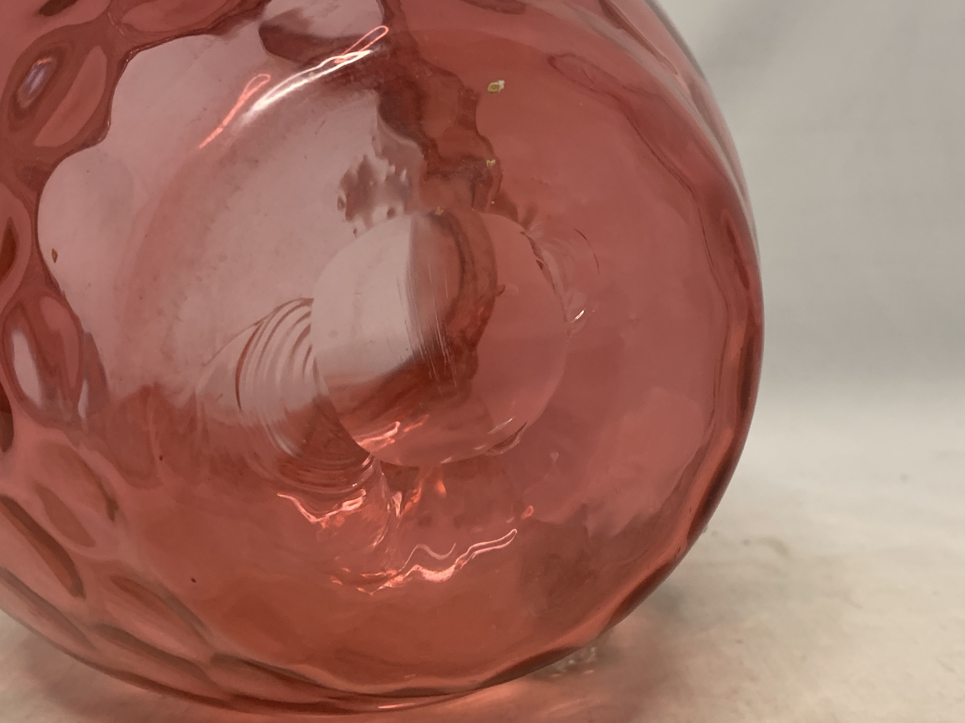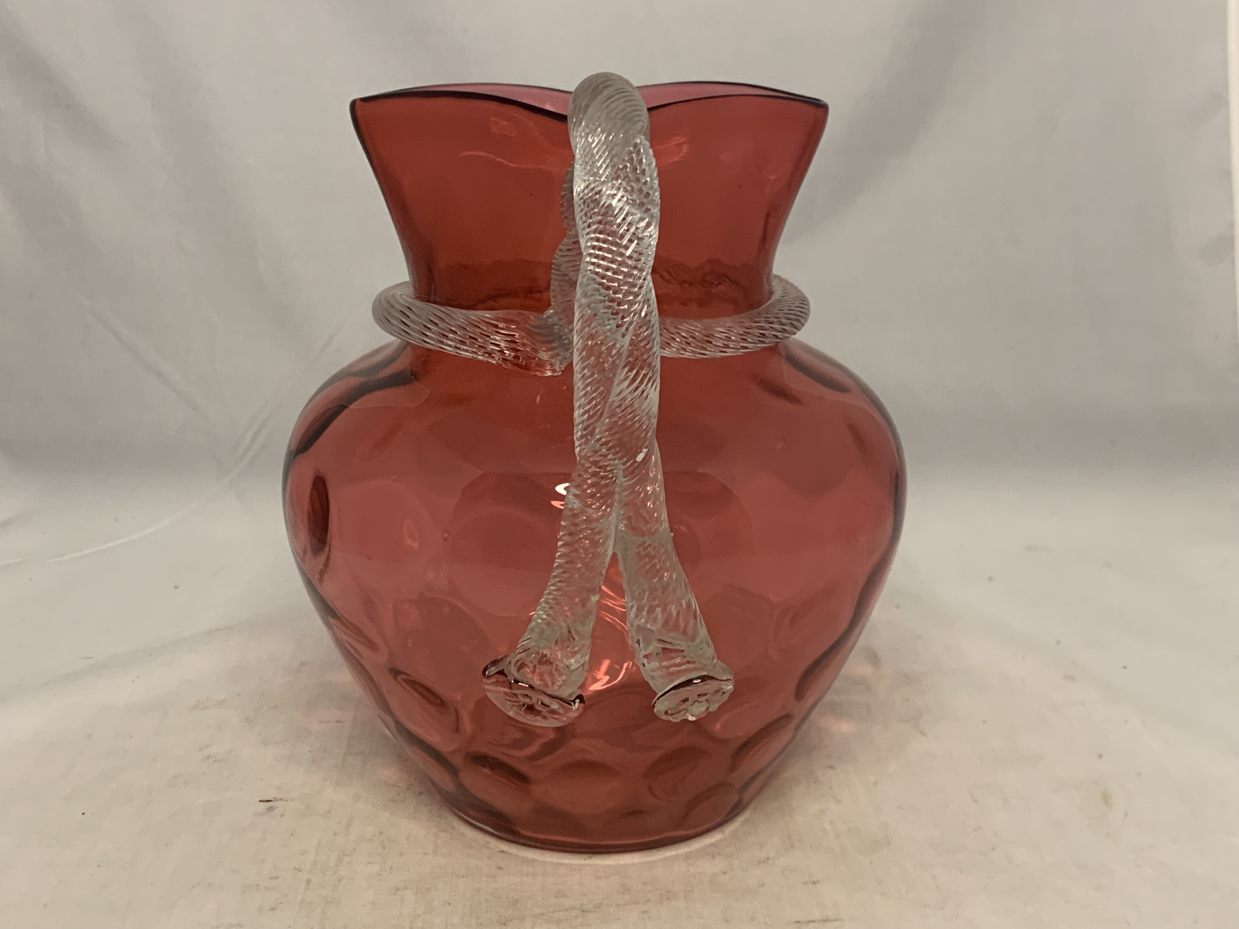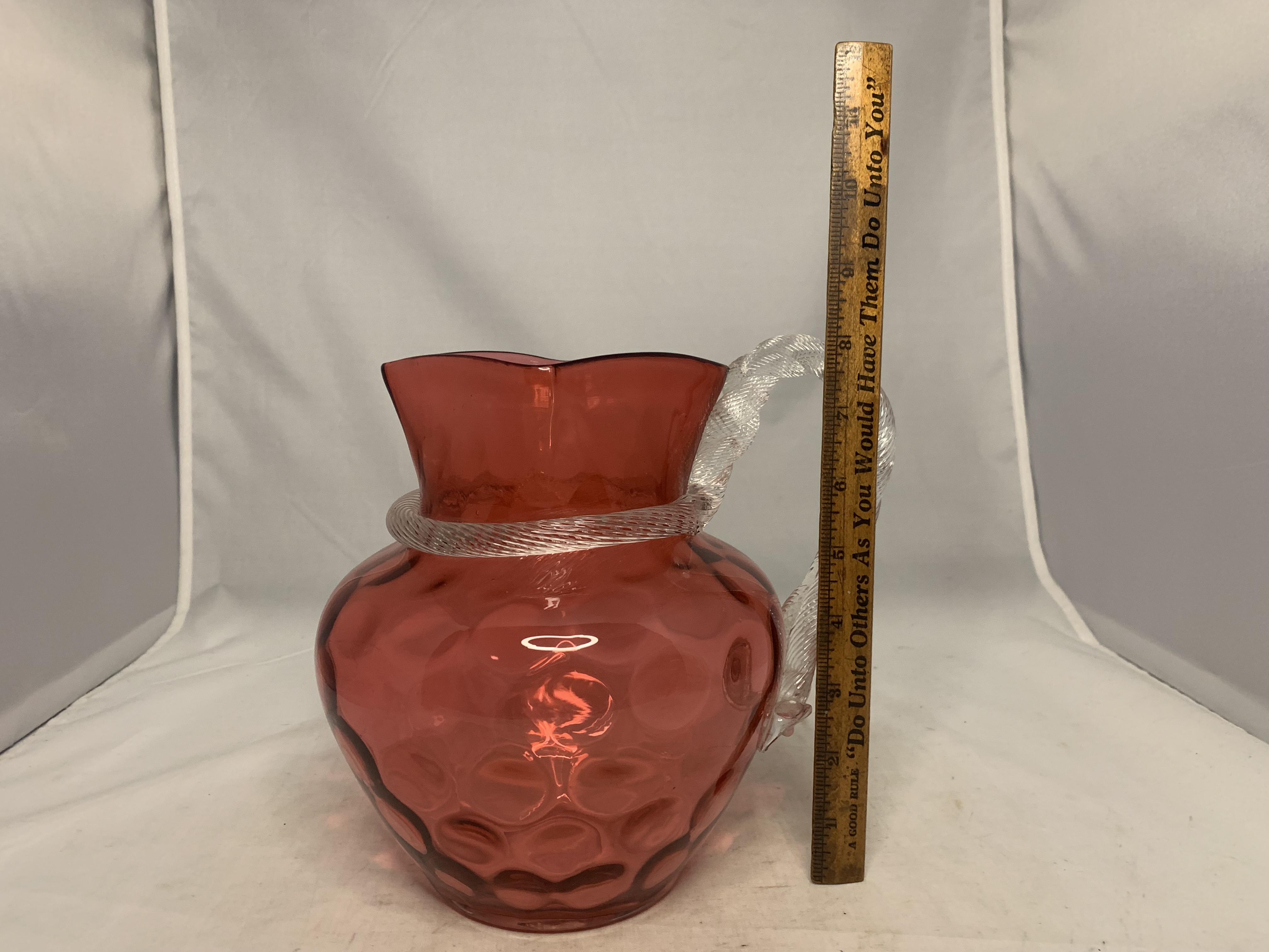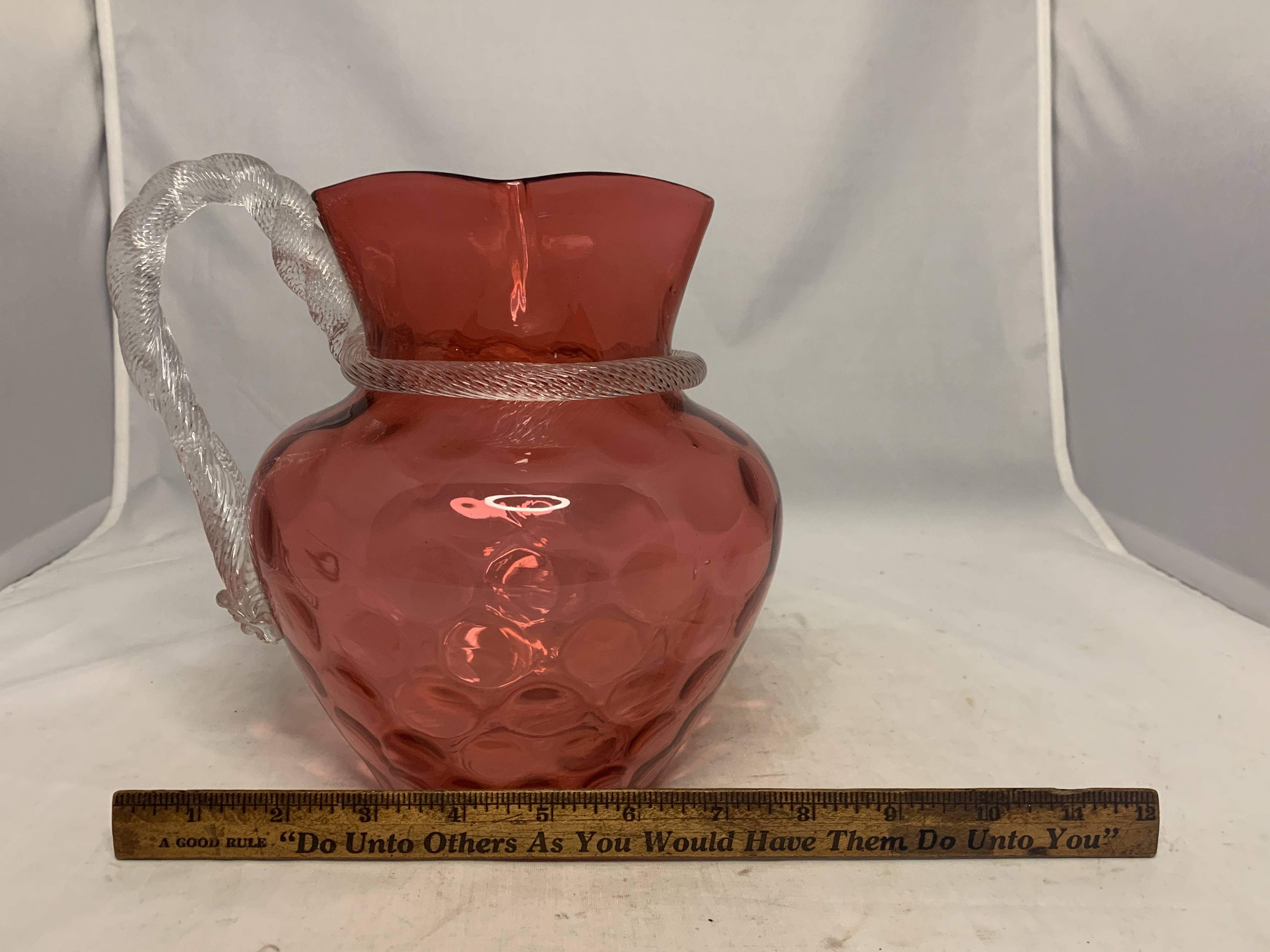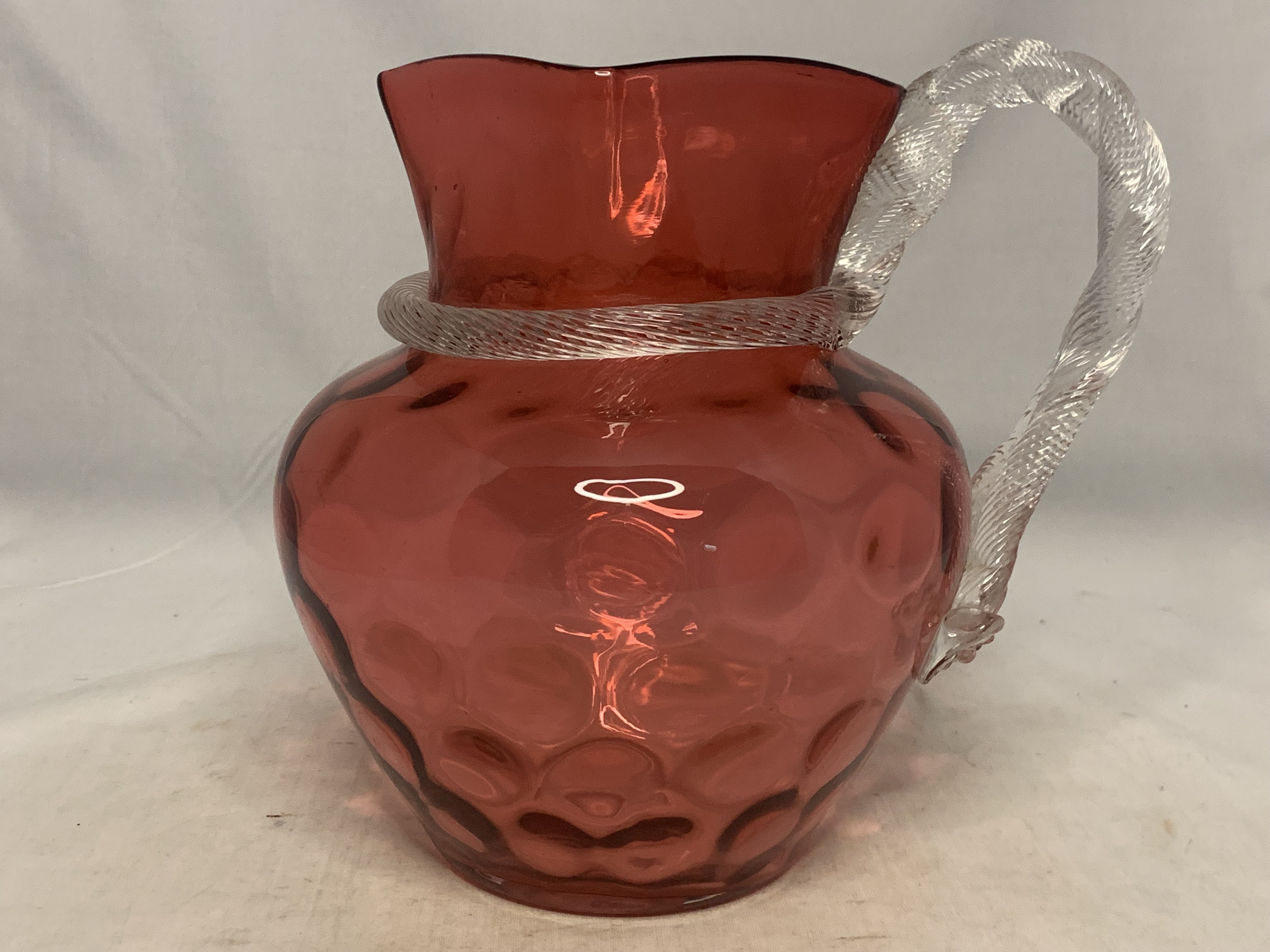Boston & Sandwich Cranberry Glass Spot-Optic Pitcher with Rope Twist Handle for your consideration. The pitcher measures approx.