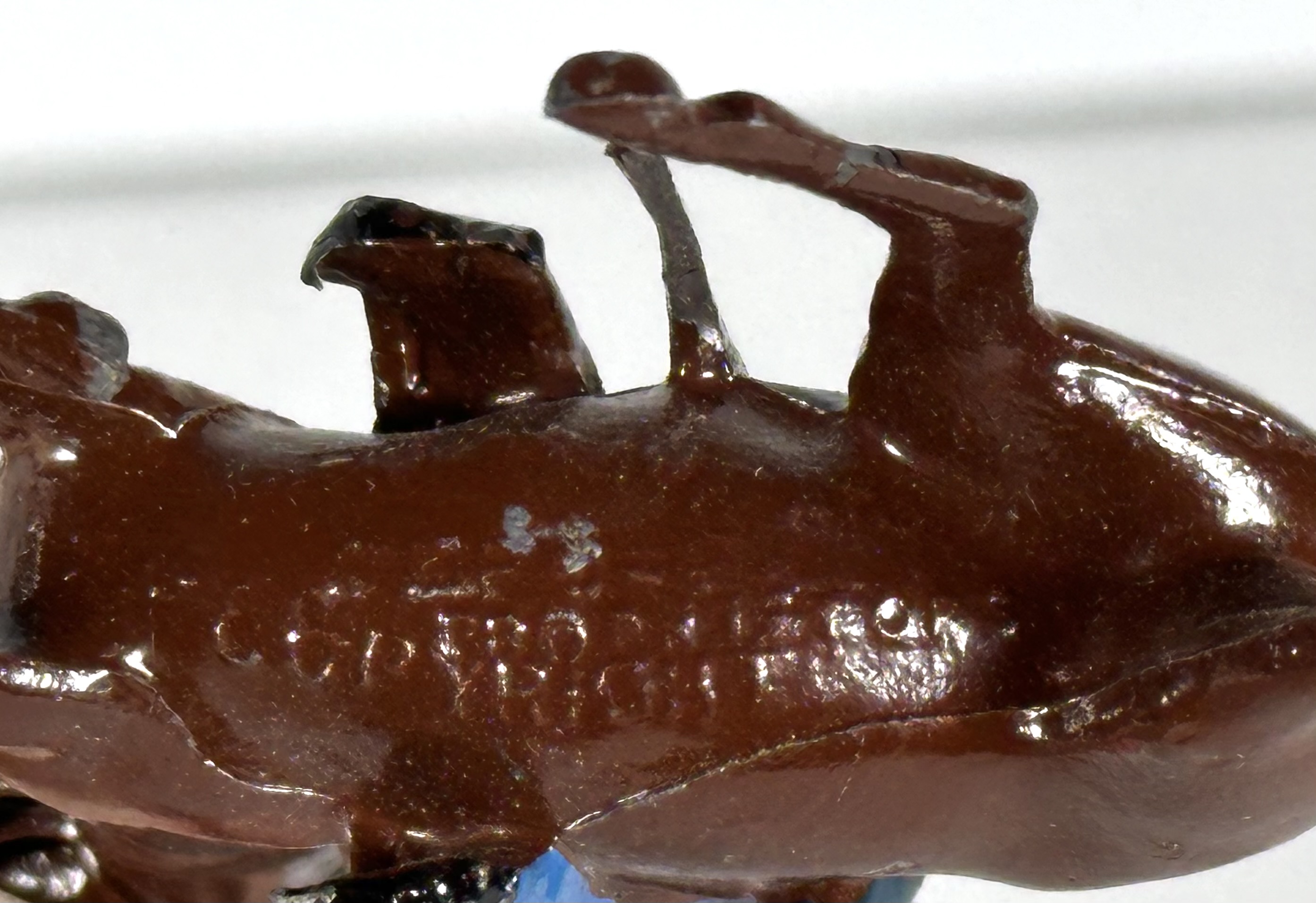 Rare & Original Vintage W Britains Civil War Confederate Calvery Lead Toy Horse Riding Soldiers, Five Piece Box Set for your consideration. The box measures approx. 18 1/4 inches long, 3 5/8 inches wide and 1 1/4 inches deep. Each horse and rider measures approx. 2 3/4 inches tall, 3 1/4 inches long and 1 1/8 inches thick. United Kingdom, mid 20th Century. Hand painted hollowcast lead toy confederate soldiers riding on horses. Boxed set includes three riders on brown horses with adjustable arms holding rifles, one soldier on black horse with adjustable arm holding rifle and one soldier on gray horse with adjustable arm holding sword. Original box reads, “BRITAINS SOLDIERS” “REGIMENTS OF ALL NATIONS” “MANUFACTURED BY W Britain IN LONDON ENGLAND” “TRADE MARK” “NO 459993” “UNITED STATES OF AMERICA CIVIL WAR CONFEDERATE CALVERY” “NO. 2055”. Very good vintage, played with condition. Shows wear commensurate with age and use. One of the brown horse riders is missing hand and rifle, plus the horse is missing back left hoof (ref. photos 15 & 16). See photos. Displays spectacular! A must for any avid toy collector, Scarce!