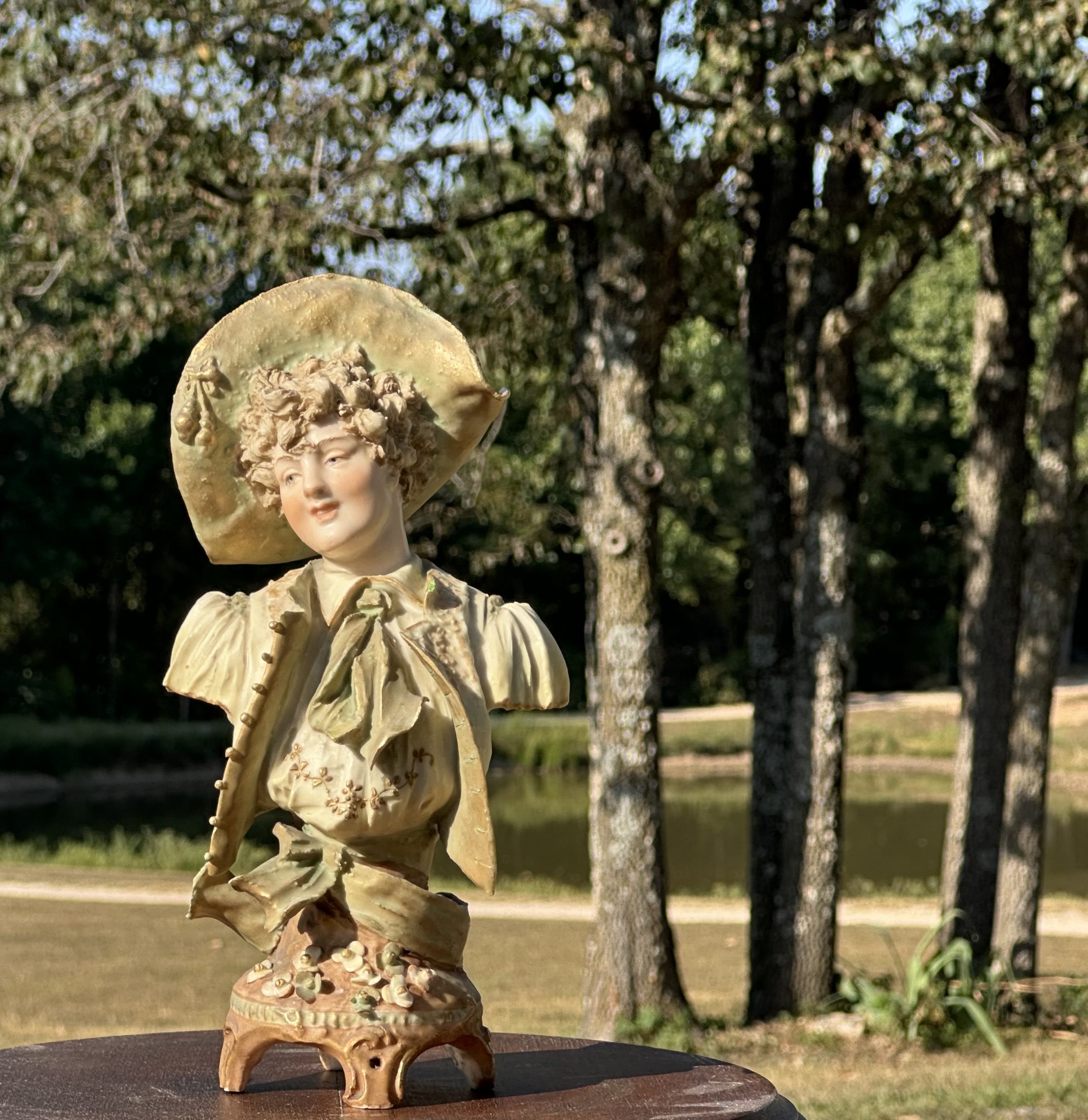 E. W. Turn Wein Porcelain Maiden Bust for your consideration. The bust measures approx. 9 1/2 inches tall, 5 inches wide and 3 1/2 inches deep. Bohemian, late 19th to early 20th Century. Art Nouveau. Ernst Wahliss (1836 – 1900), Turn-Teplitz. Hand painted porcelain bust of lovely maiden in Victorian dress. White overcoat and blouse with pale green scarf, waist sash and sunbonnet. Quad-footed floral base. Several marks on base including partial E. W. Turn crown mark that reads, “Made in Austria” in blue, a handwritten, “133 G” mark in gold ink and an impressed, “4008” mark. Good antique condition. Shows wear commensurate with age. Several fleabites throughout. One of the flower petals at base is chipped as well as the back rim of her hat. Condition issues are not noticeable except under close examination. See photos. Displays gorgeous!