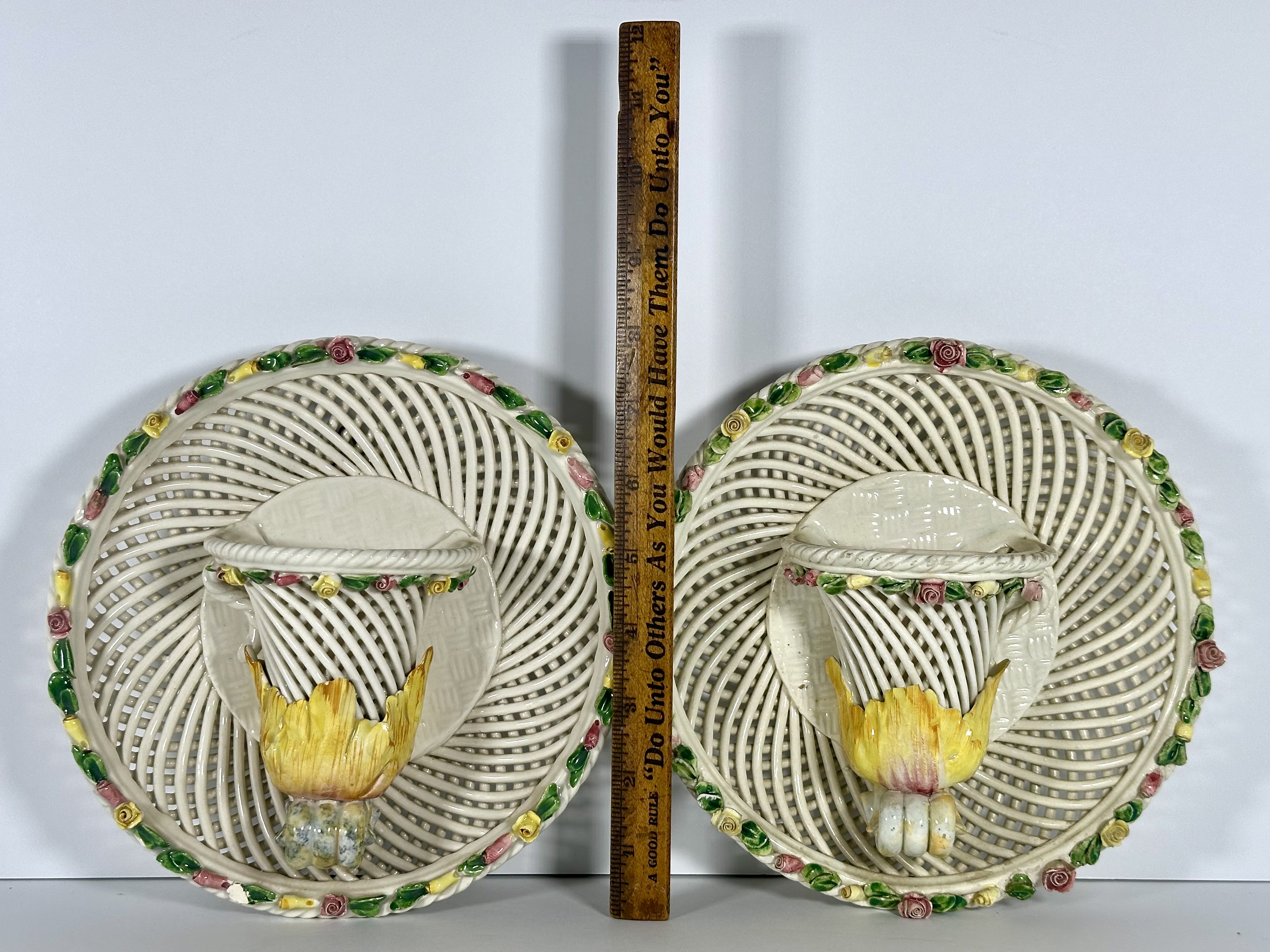 Pair of Italian Porcelain Pottery Woven Lattice Basketweave Wall Pockets for your consideration. Each wall pocket measures approx. 8 inches in diameter and approx. 3 inches deep. The wall pockets have porcelain inserts, each measuring approx. 2 1/2 inches tall, 2 7/8 inches wide and 2 inches deep. Italian, 20th Century. Majolica, faience style, hand painted. Delicate porcelain basketweave circular design with tulip-stylized sconce/wall pockets. Applied porcelain floral motifs decorating the borders. Each wall pocket has impressed, “ITALY” and “123” marks and one wall pocket has, “C/3” mark. Very good vintage condition. Shows wear commensurate with age and use. A few nicks and small chipping to flower adornments. One insert has shallow flake to back. Condition issues are not noticeable except under close examination. See photos. Displays elegantly!