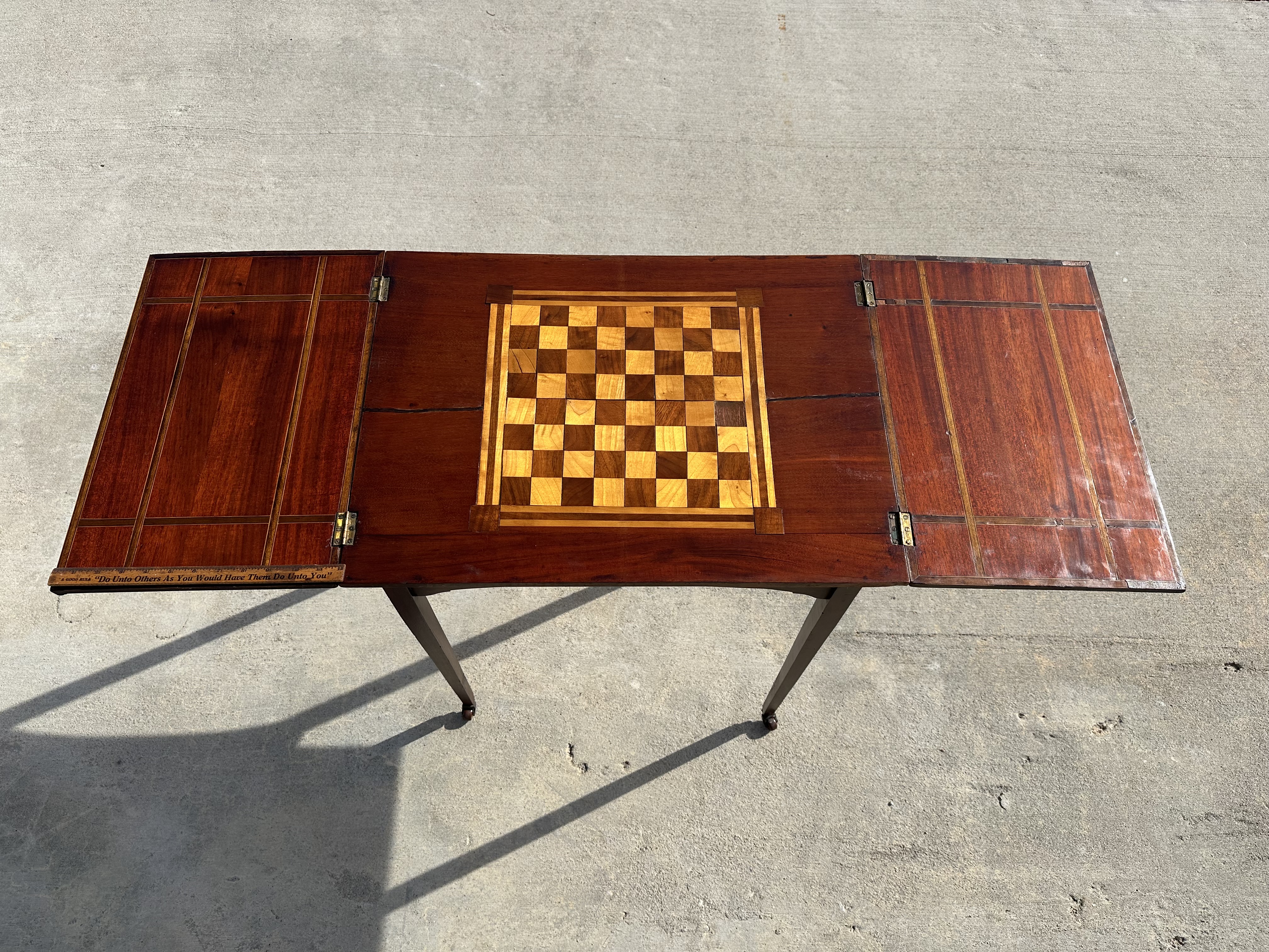 Louis XVI Marquetry Game Table for your consideration. The table measures approx. 28 3/4 inches tall, 47 1/2 inches wide (extended), 24 inches folded-in and 18 inches deep. Continental, French or German, 18th Century. Mahogany construction with beautiful walnut inlay accents on exterior and interior of tabletop. Extendable slide supports on either side, double hinged fold-out gaming tabletop, revealing marquetry chess board underneath, alternating dark and light inlaid squares. Single drawer with brass knob and further inlay decoration. Wonderfully crafted, tapered legs resting on small casters. Overall, good (restored) antique condition. Shows wear commensurate with age and use. Chess checkerboard is a bit warped, uneven. Replacement to one walnut square inlay. Restoration filled crack that runs down the center of the gameboard tabletop to support and prevent further distortion. Other condition issues include but are not limited to, scratches, dents, marks, stains, splits, cracks, inlay loss, historical restorations and alterations, etc. Solid and ready to use (gently). Natural, warm patina! See photos. Even with condition issues, a nice example of an early & rare gaming table, displays splendid!