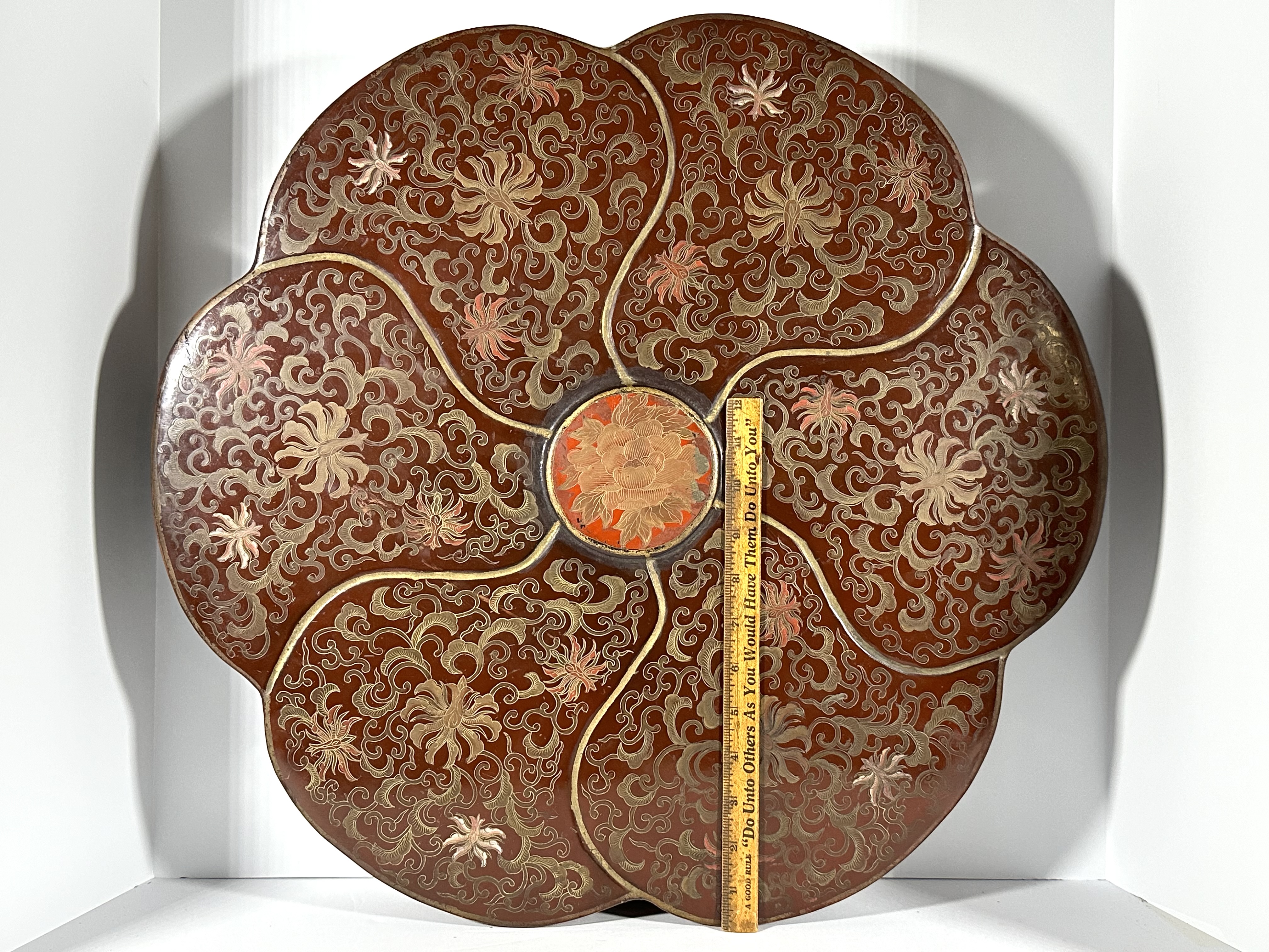Huge Antique Chinese Red Lacquer Tianqi Qiangjin Box for your consideration. The box is massive, measuring approx. 21 1/2 inches in diameter and approx. 4 inches tall. Chinese, Qing Dynasty, possibly earlier. Red Lacquer, six pedal flower form. Finely hand decorated gold gilt floral motifs on pedals. Raised circular gold gilt lotus in center. Further adornments of floral and labyrinth hand painted details along the sides. Inside and underside base of box is black lacquered. Skillfully crafted lidded box is tightly fitted and secure. Very good antique condition. The box shows wear commensurate with age and use. Minor chipping and cracking, mainly contact areas on sides where lid meets box base. See photos. Displays important, museum quality!