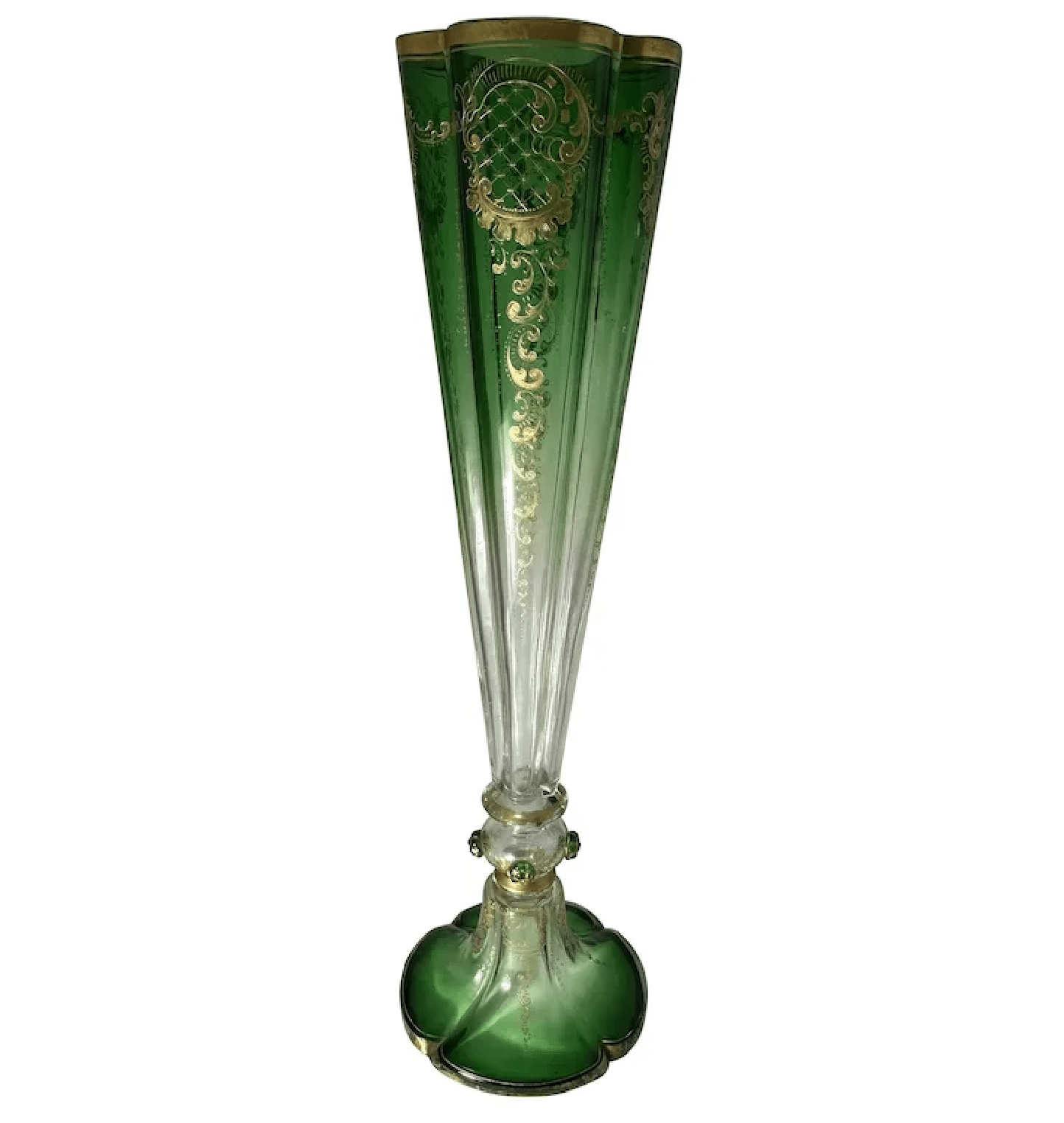 Antique Moser Green to Clear Trumpet Vase for your consideration. The vase is large, measuring approx. 18 1/2 inches tall, 4 3/8 inches top diameter and approx. 5 5/8 inches base diameter. Late 19th to early 20th century; Bohemian. Quad-lobed fluted form. Applied decorative berries near foot. Heavy gold gilt cartouche motifs throughout. Excellent antique condition. No chips or cracks. Shows minor wear commensurate with age. Gilding is a bit faded in several areas, mainly towards the base edge. See photos. Displays monumental, Impressive!
