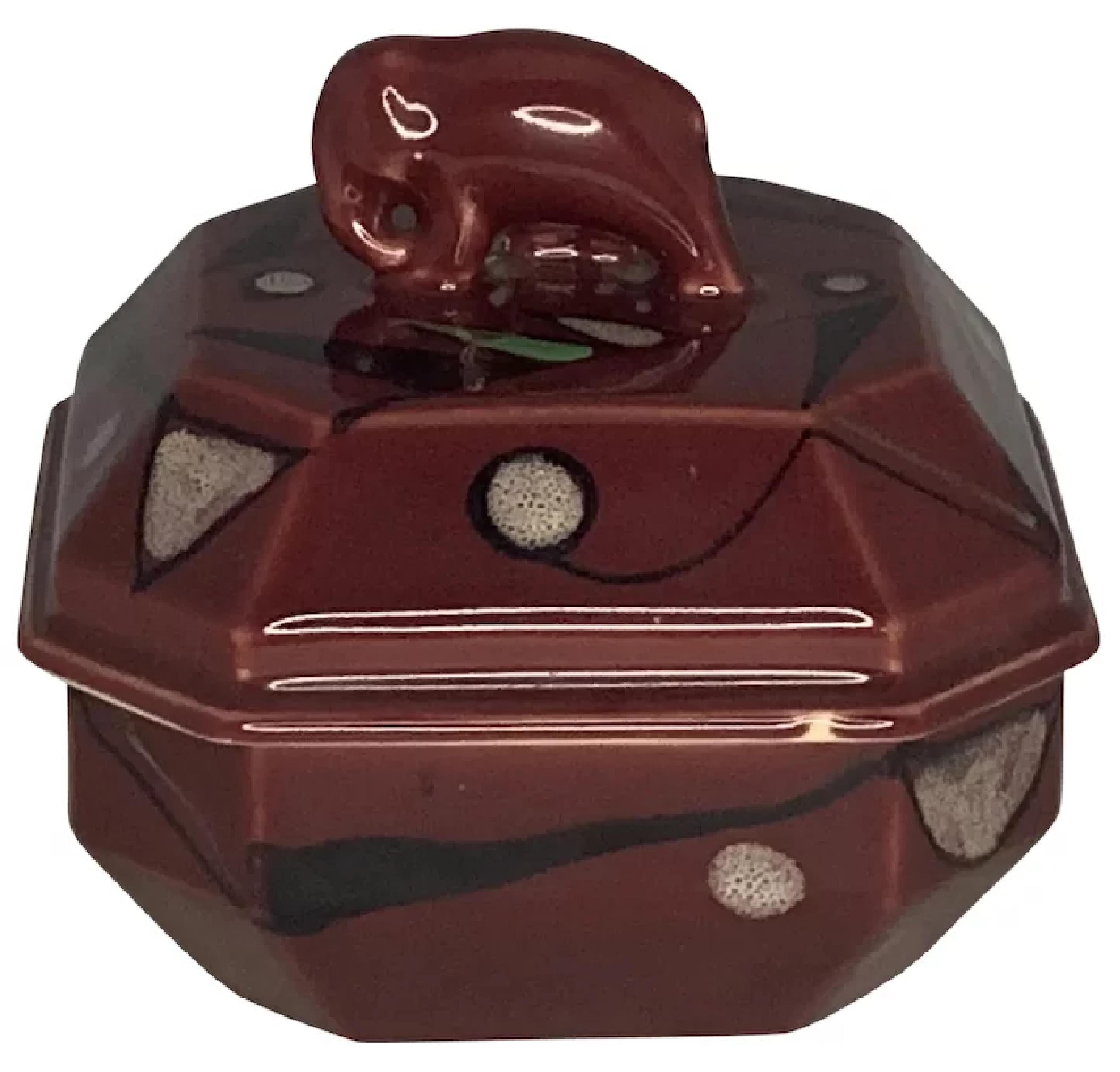 Rare Art Deco Ceramic Elephant Powder Jar/Box for your consideration. The jar measures approx. 4 1/4 inches tall, 4 1/2 inches wide and 4 1/2 inches deep. Likely made in Japan, c. 1930s. Hand Painted. Quintessential Art Deco. Figural elephant finial on top of lid. Octagonal shaped purple box with decorated circle and triangle lined designs in white, black and green colors. Impressed, “X” mark on base. Very good condition. Shows wear commensurate with age and use. Fleabite and short hairline to mainly inside rim. Not noticeable except under close examination. See photos. Displays pleasantly; Scarce!
